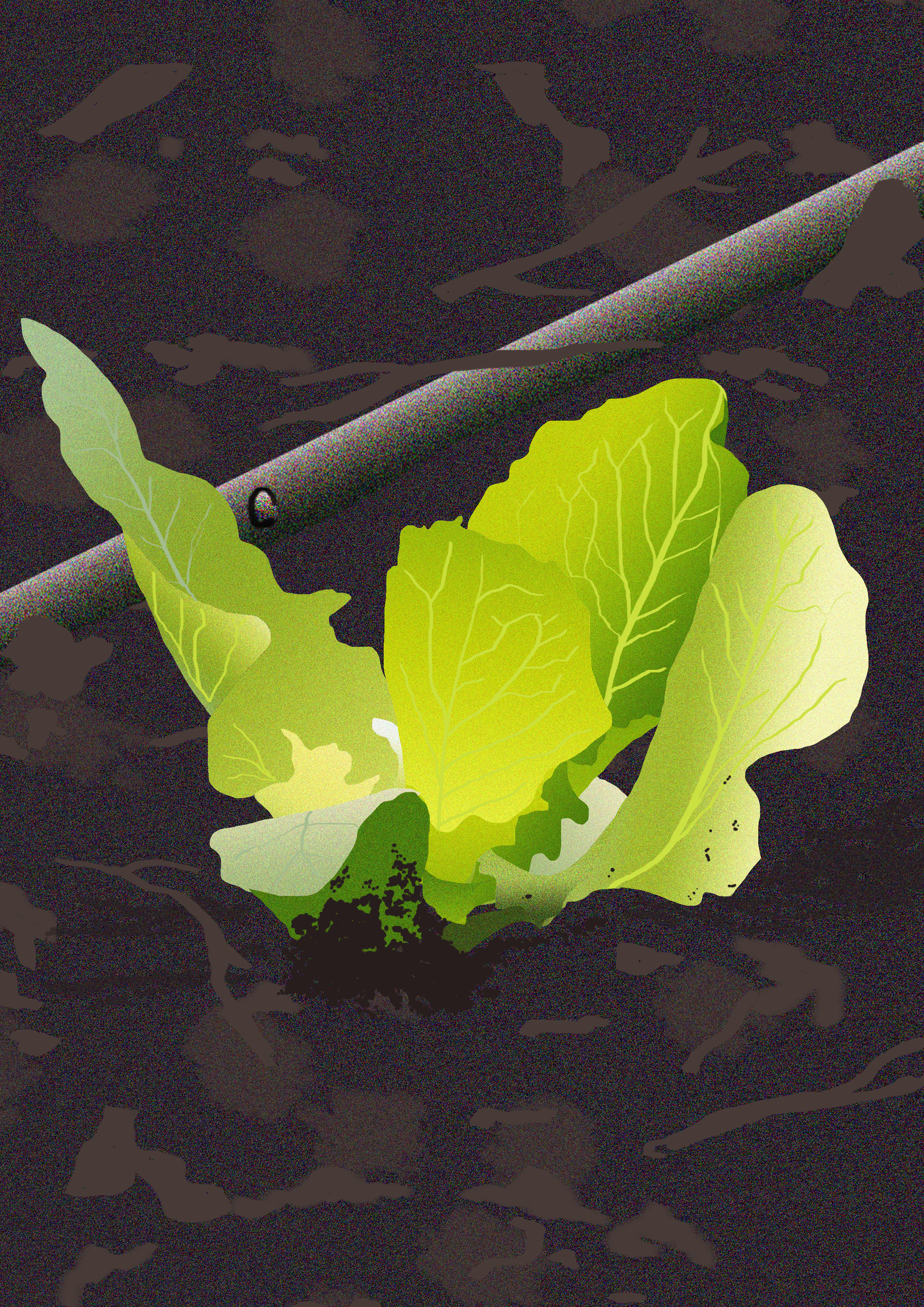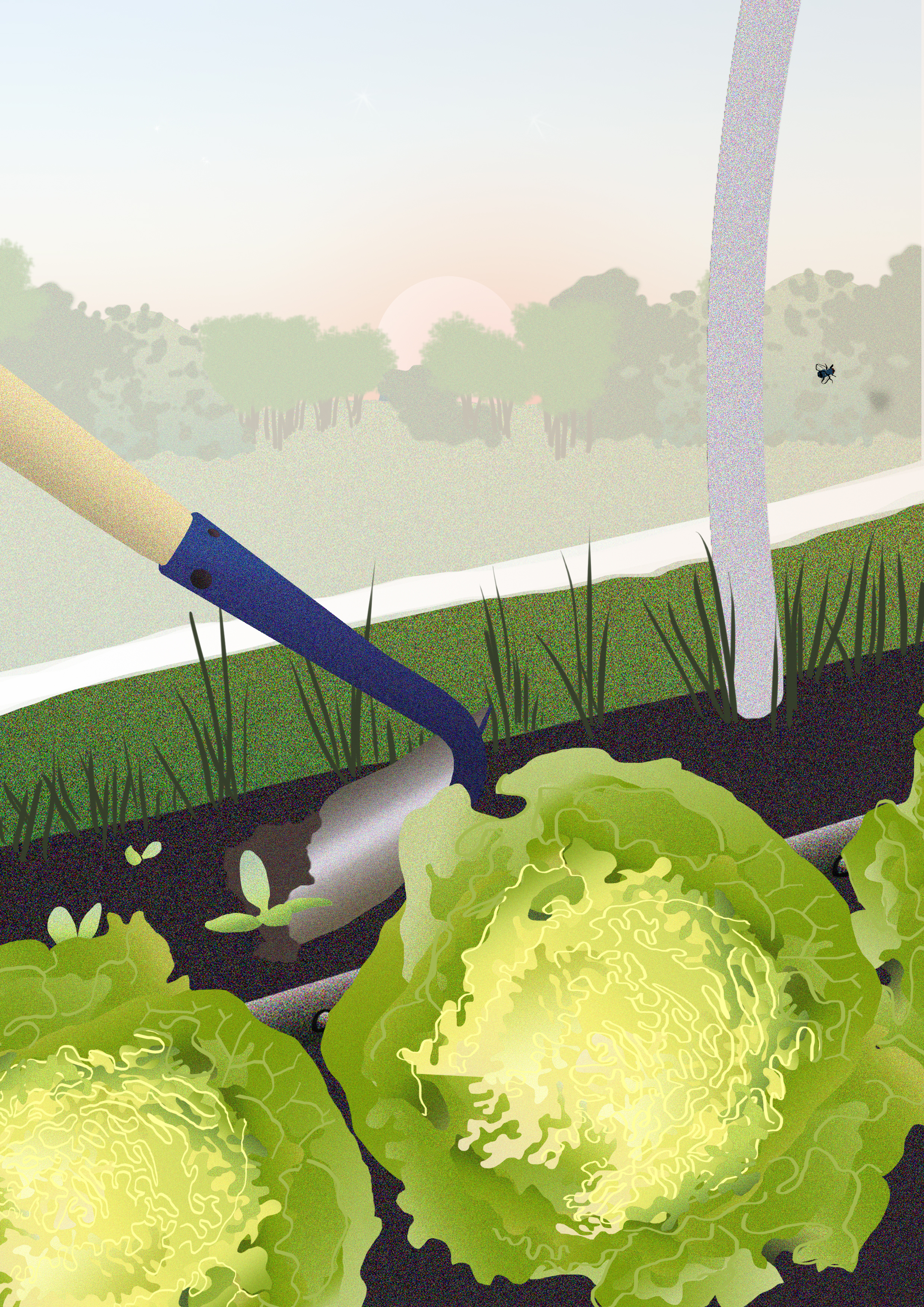 Trois semaines après les semis, la plante a déjà 4 petites feuilles, Andrea la repique alors dans un sol meuble en heure fraiche pour éviter à la salade un stress hydrique. Andrea veille à bien aérer la serre et irriguer régulièrement, de préférence le matin, grâce à un système de goutte à goutte au pied des salades. Mouiller les feuilles risque de développer des maladies. Andrea désherbe avec une binette ou un sarcloir pour éviter la concurrence des adventices. L’année dernière, il a beaucoup plu et Andrea a dû chasser limaces et escargots qui dévoraient ses jeunes salades. A contrario, une trop forte chaleur stresse la salade et la fait monter en graine plus rapidement.