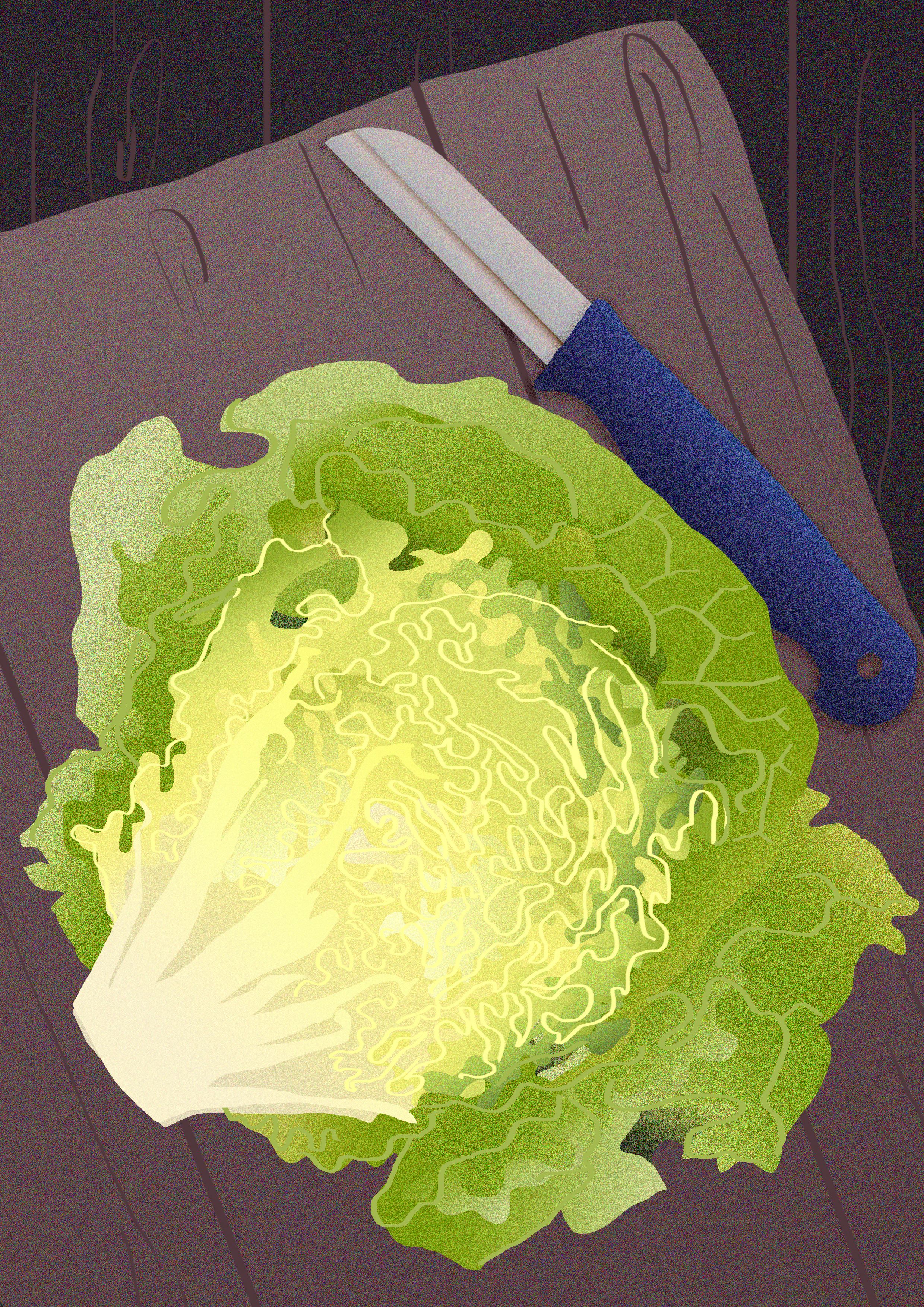Au printemps, la salade se récolte environ 30 jours après sa plantation, une fois que la pomme est bien formée et avant que la plante ne monte en graine. Andrea utilise son couteau pour couper la base de la salade, elle fait la récolte tôt le matin ou en fin de journée, afin de conserver au maximum la fraîcheur de la salade. La salade sera ensuite rincée pour éviter que le latex ne brûle les autres feuilles.