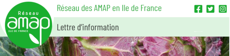 Chaque mois, le Réseau AMAP IdF diffuse l'essentiel de ses actualités et de son agenda à ses membres et sympathisant·es. Des nouvelles des champs, les dernières actions de mobilisation, le point sur des projets du Réseau, des recettes… chacun·e y peut y trouver de quoi se tenir au courant, consolider ses connaissances sur le monde agricole et l'alimentation, ou s'impliquer davantage dans le Réseau ou dans son AMAP !